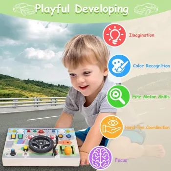 Busy Board Wooden Steering Wheel Toy for Kids - Sensory Fun & Learning Travel Activity